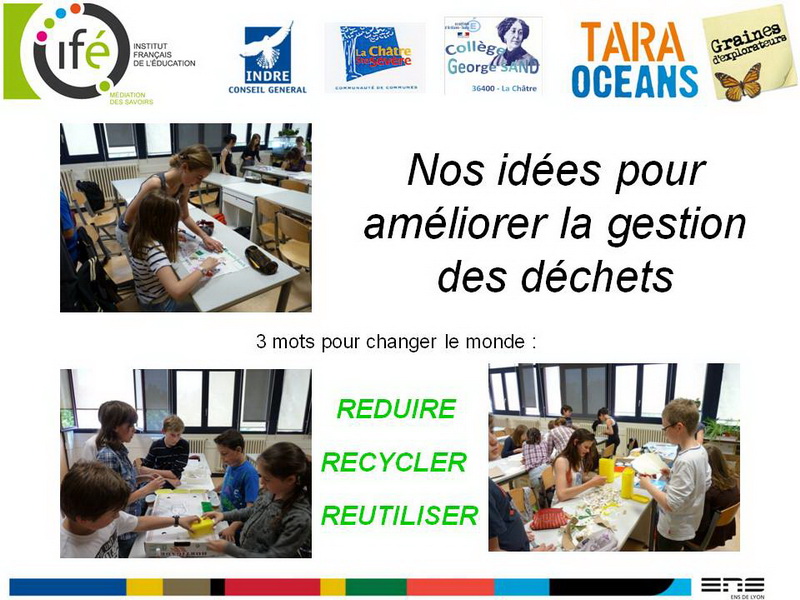 Nos idées pour améliorer la gestion des déchets sont modestes mais si chacun fait un effort pour réduire ses déchets, en pensant à réutiliser ce qui peut l’être, et à recycler alors comme sur TARA nous réussirons à produire beaucoup moins de déchets.