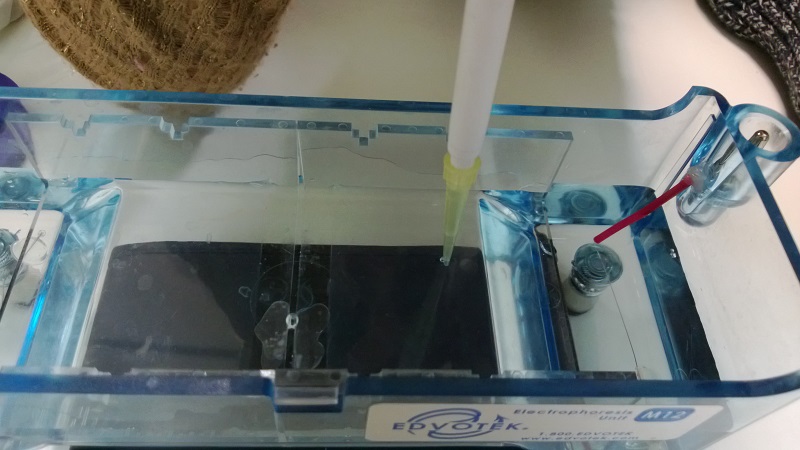 On place le gel de migration dans une solution à pH constant, qui charge l'ADN négativement. L'ADN est déposé dans les différents puits du gel. On branche la cuve pour générer un champ électrique.