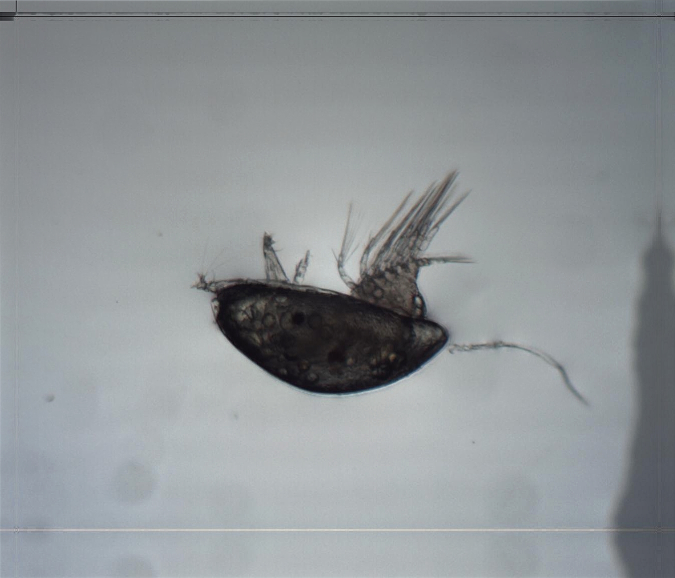 Avant de se fixer sur un rocher, la larve nauplius se transforme en larve cypris. On y remarque les 8 appendices sortant de la coque.