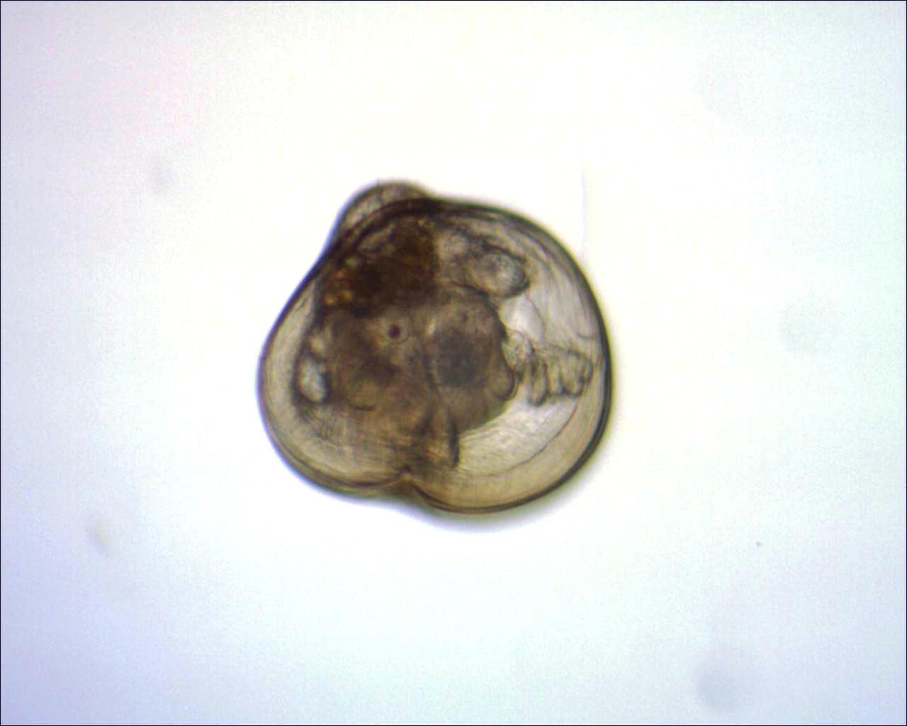 Petite larve de mollusque pêchée le 16 novembre. Sa coquille déformée laisse penser que l'eau était polluée. (Présence de pesticides?)