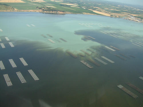 Malaïgue de 1997 sur les installations conchylicoles de la lagune de Thau : l’étendue de la zone anoxique correspond à la tache blanche qui est le résultat du métabolisme bactérien anaérobie - photographie H. Farrugio / Ifremer